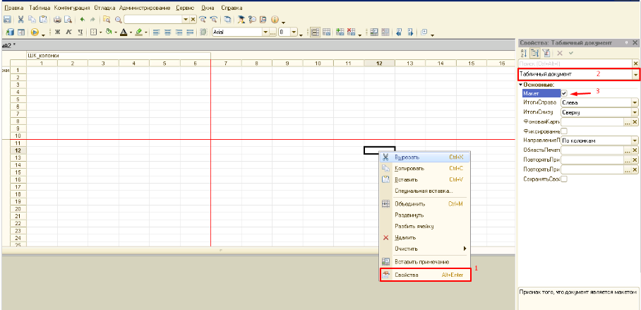 9. Далее кликните правой кнопкой мышки в любое место таблицы и выберите "Свойства" 10. В верхней строке открывшейся таблицы, где написано Ячейки выберите "Табличный документ" 11. Поставьте галочку напротив строки Макет. Иначе таблица не будет считываться в шаблоне формирования ШК