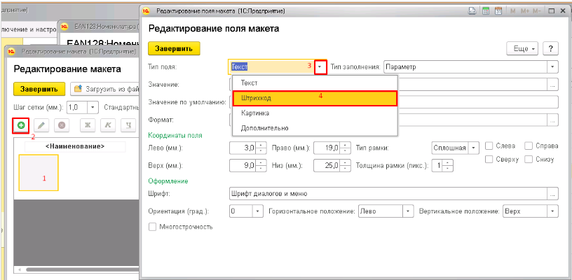 1.Выделите нужную область 2.Нажмите кнопку Добавить. 3.Выберите Тип поля Штрихкод.