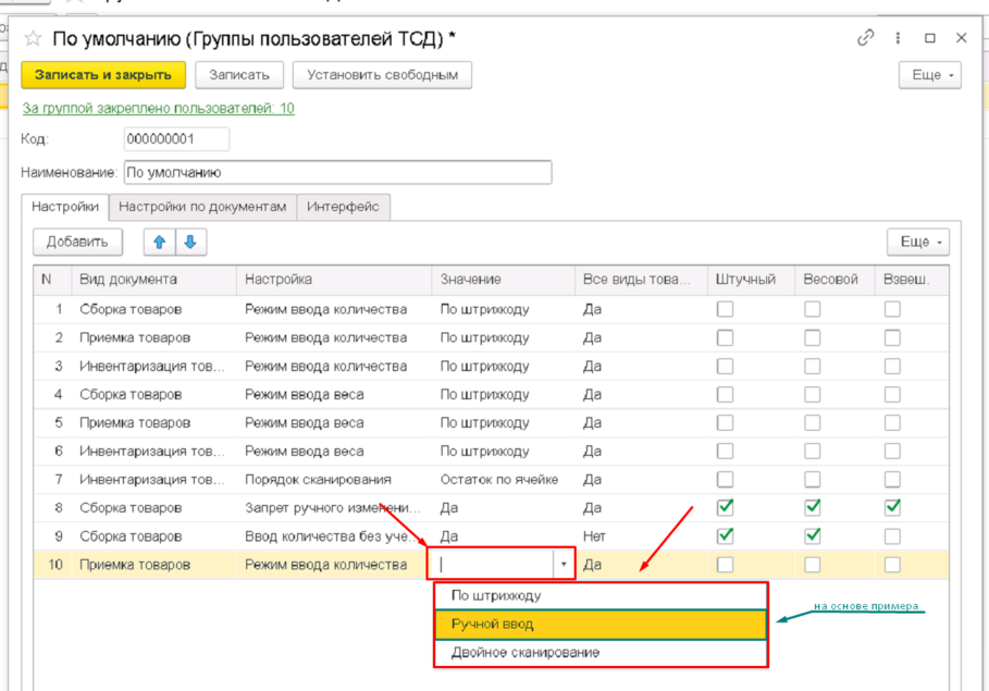 Например, вам нужно чтобы для документа приемки режим ввода количества был ручной.