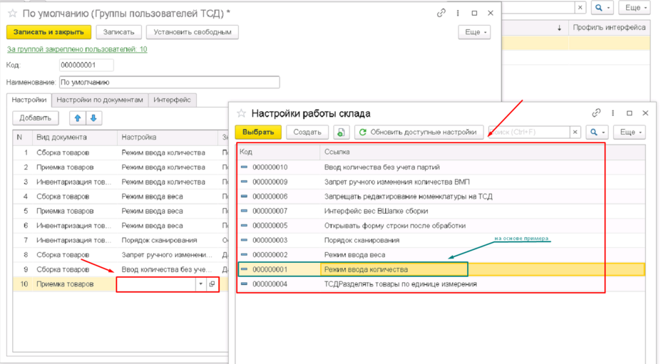 Для этого выбираем документ приемки, выбираем саму настройку, на основе примера это будет "Режим ввода количества".