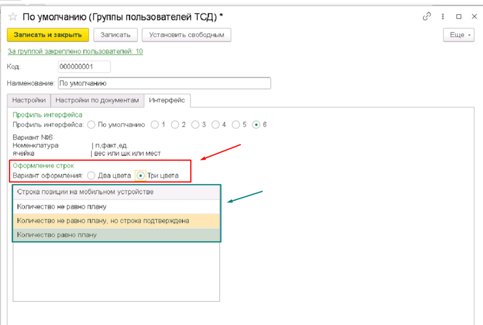 Во вкладке "Интерфейс" можно выбрать один из шести вариантов вида профиля на ТСД, который будет отображаться у пользователей, который закреплены за этой группой.