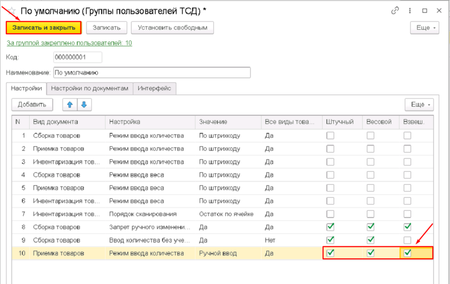 Потом выбираем галочками для каких видов товаров будет работать данная настройка. После добавления всех настроек, которые нам нужны, нажимаем "Записать и закрыть".
