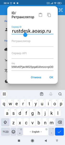 Нажмите на ID/Ретранслятор и укажите следующие настройки: сервер ID «rustdesk.aoasp.ru» (или, если проблемы с DNS на устройстве ip адрес 188.225.80.191) и KEY x0maWEHspRg6tWivKPjavWG5yqaKAhnvo+pO0I8PPOA=