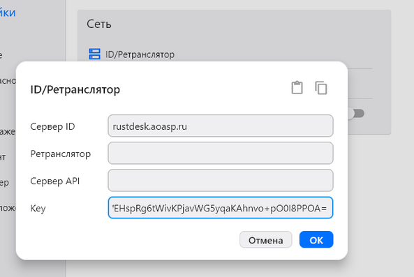 3. Откройте вкладку Настройки - ID/Рестранслятор и укажите сервер ID «rustdesk.aoasp.ru» (или, если проблемы с DNS на устройстве ip адрес 188.225.80.191) и KEY x0maWEHspRg6tWivKPjavWG5yqaKAhnvo+pO0I8PPOA=