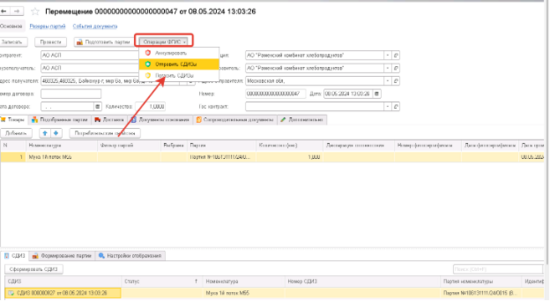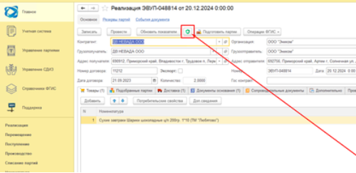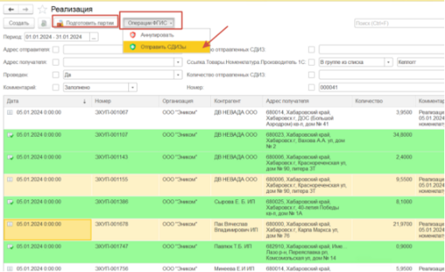 После подготовительного этапа можно приступать к выписке. Главное = > Реализация или Перемещение Выписывать можно по 1 кнопке, а можно по двум. По одной сразу выполняется подготовка партий и отправка СДИЗОВ на регистрацию Можно выделить и несколько документов и работать с ними из общего списка, а можно зайти в конкретный и работать внутри него