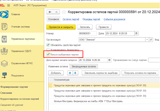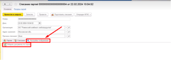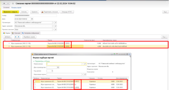 - Выбрать галочками партии, которые надо списать