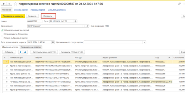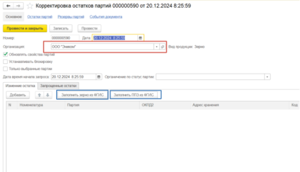 Выбрать организацию и нажать Заполнить ППЗ из ФГИС если нужны остатки по ППЗ. Если нужны остатки по зерну то Заполнить Зерно из ФГИС.