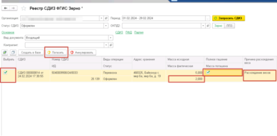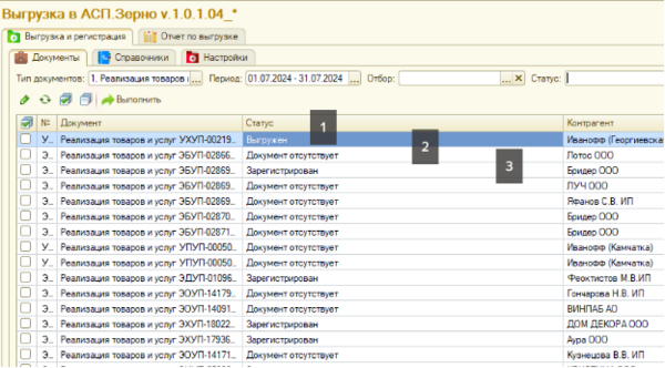 - Выгружен — документ выгружен в АСП Зерно
