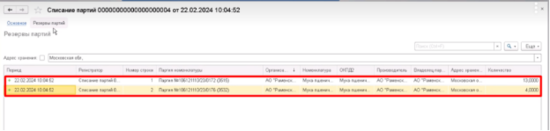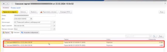 Документ списания, который регистрируется во ФГИСе, делает следующие движения - он непосредственно в остатках уже списывает эту партию, и списывает ранее сформированный, нашим основным документом, резерв. Таким образом резерв ушел в 0, то есть был снят, остаток списан
