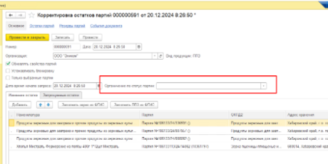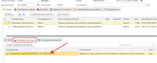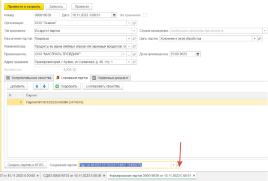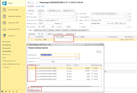Также внутри документа можно выбрать конкретную партию в поле Фильтр партий.
