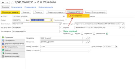 Выбрать документ и нажать Операции ФГИС - Аннулировать Аннулируется и СДИЗ и партия