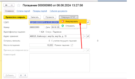 В партии нажать Операции ФГИС - Аннулировать