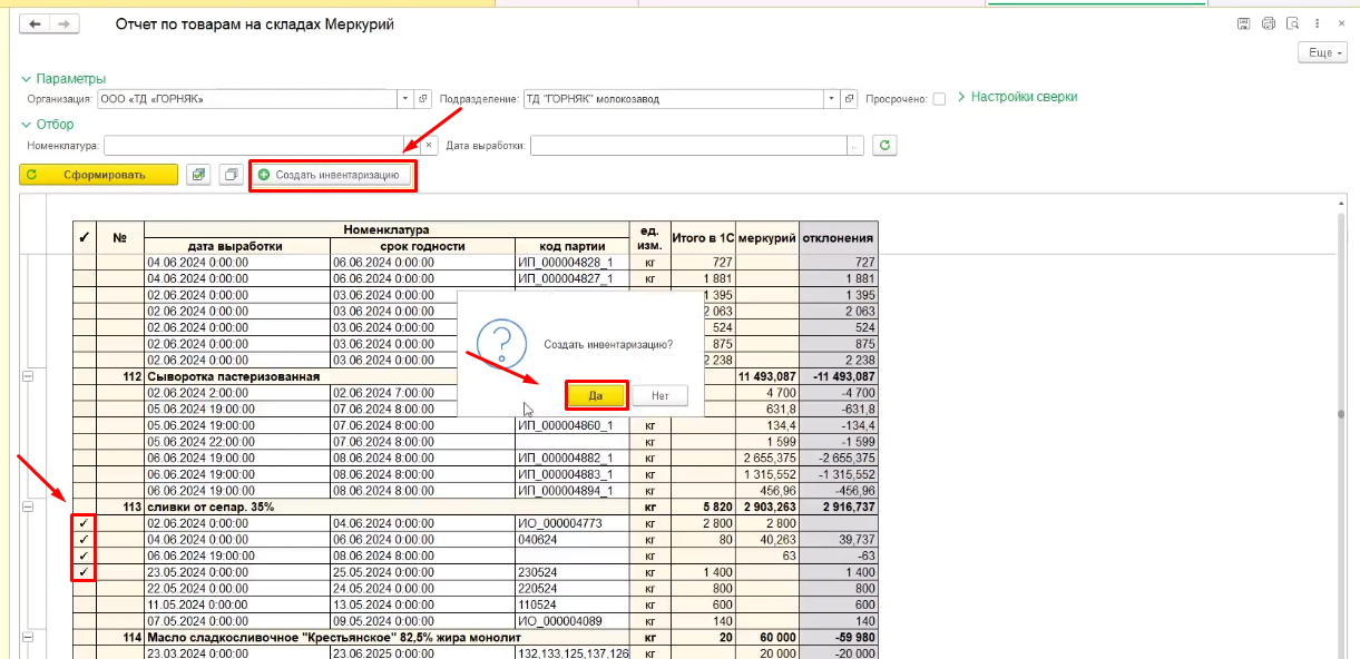 Для того, чтобы создать инвентаризацию на выделенные строки, необходимо выбрать строки галочками и нажать "Создать инвентаризацию", на вопрос ответить "Да".