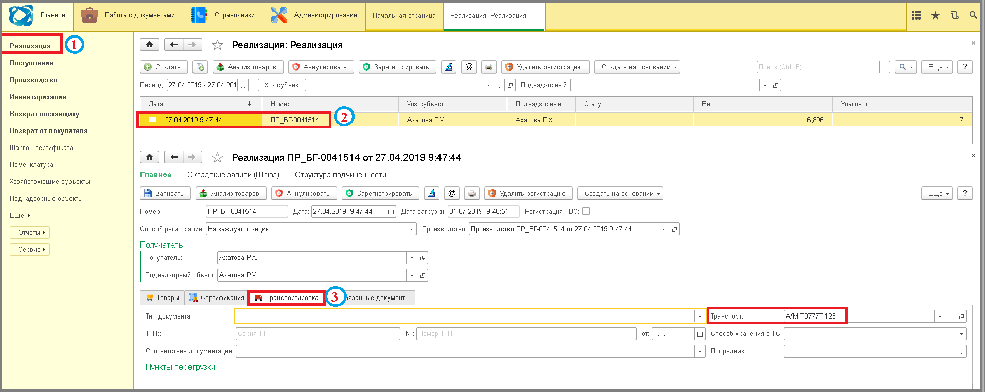 - Перейти на вкладку "Транспортировка" => В поле "Транспорт" отобразился номер транспорта заданный в Обработке АСП.Шлюз.
