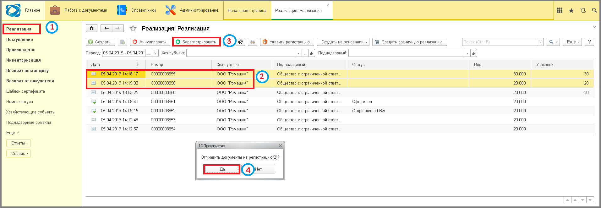 - Нажать кнопку "Зарегистрировать" => Появится сообщение: "Отправить документы на регистрацию".