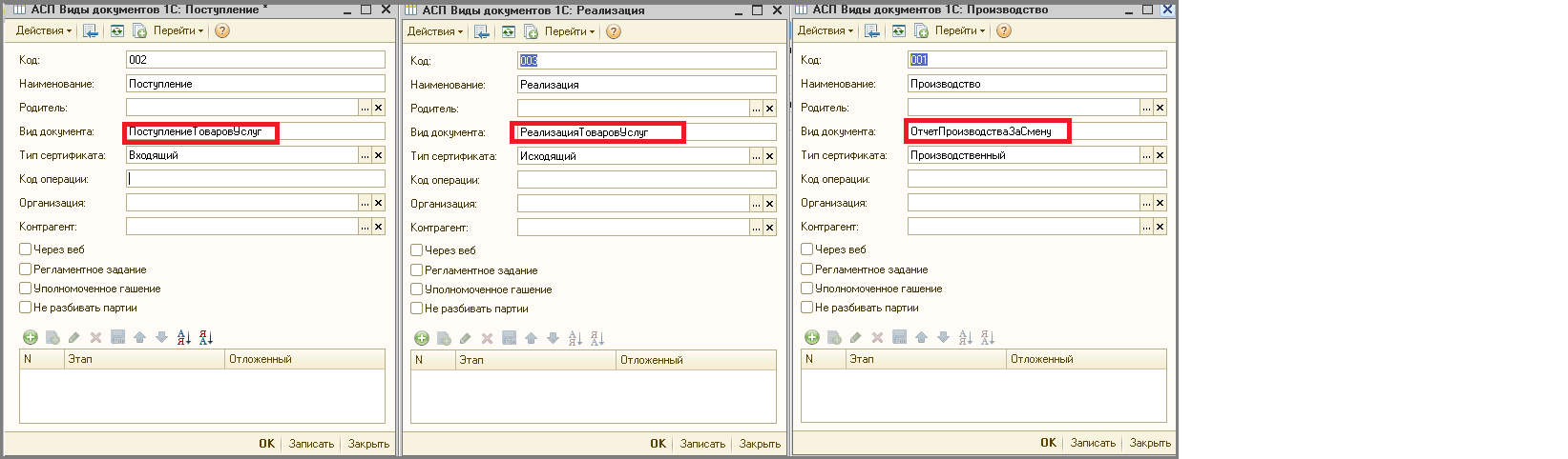 - Нажать кнопку "Создать" => Появится окно "АСП Виды документов 1С".