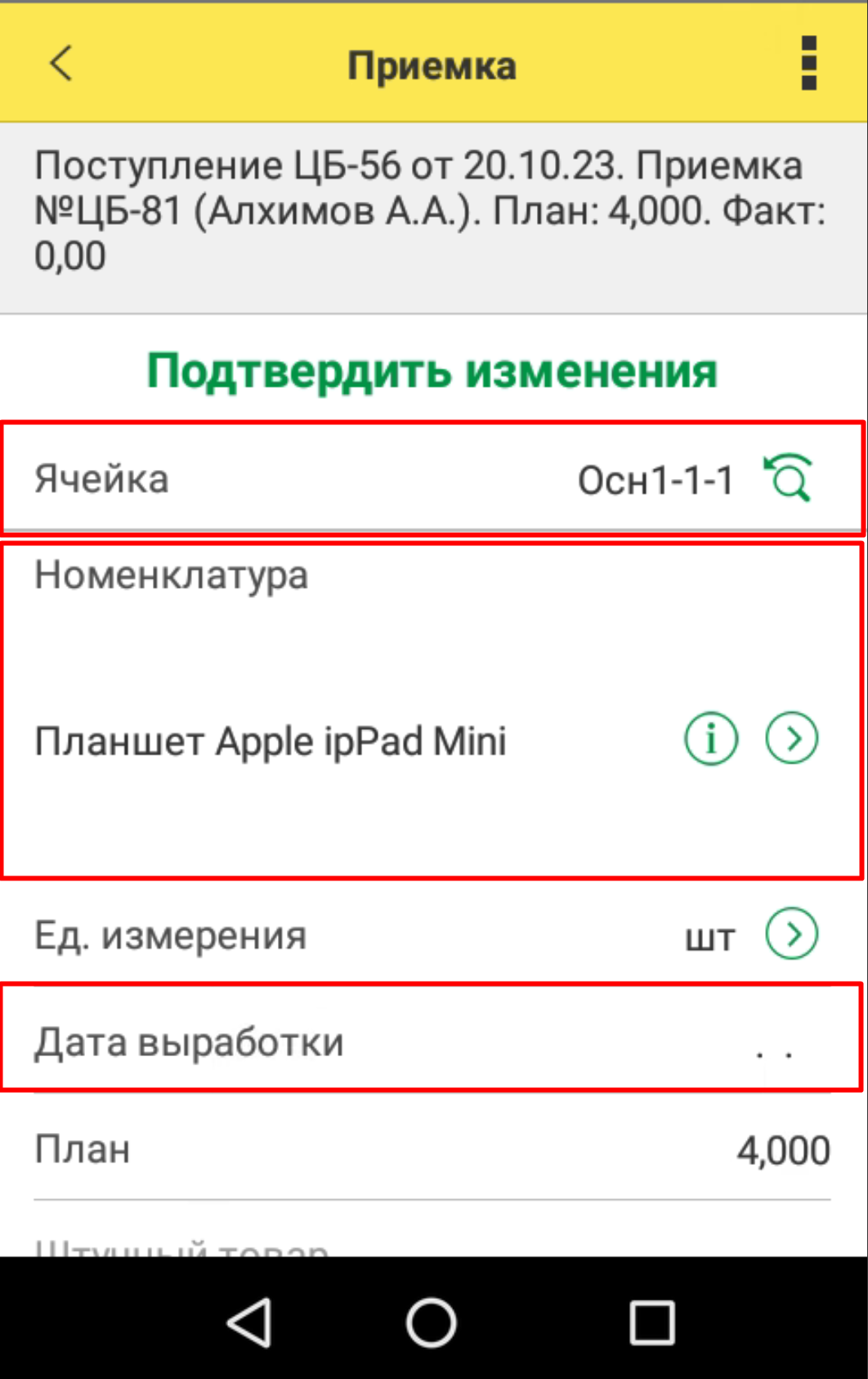 Сначала ячейка, потом номенклатура - позволяет отсканировать ячейку из списка товаров, откроется список товаров, которые есть в этой ячейке, далее сканируем товар, ячейка при этом будет уже подтверждена;