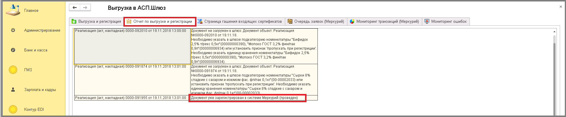 Результат можно увидеть на вкладке "Отчет по выгрузке и регистрации".