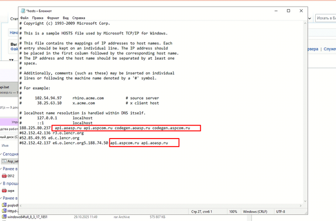 Добавление записей в hosts в случае недоступности api.aspcom.ru