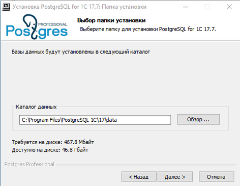 Здесь укажите папку на диске, где будет располагаться база данных. Учитывайте, что размер базы данных может значительно вырасти. Рекомендуется устанавливать на диск с более чем 100 гб свободного места.